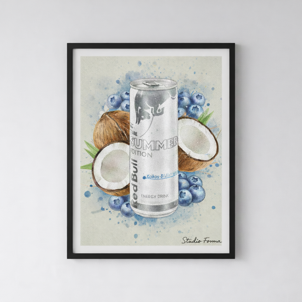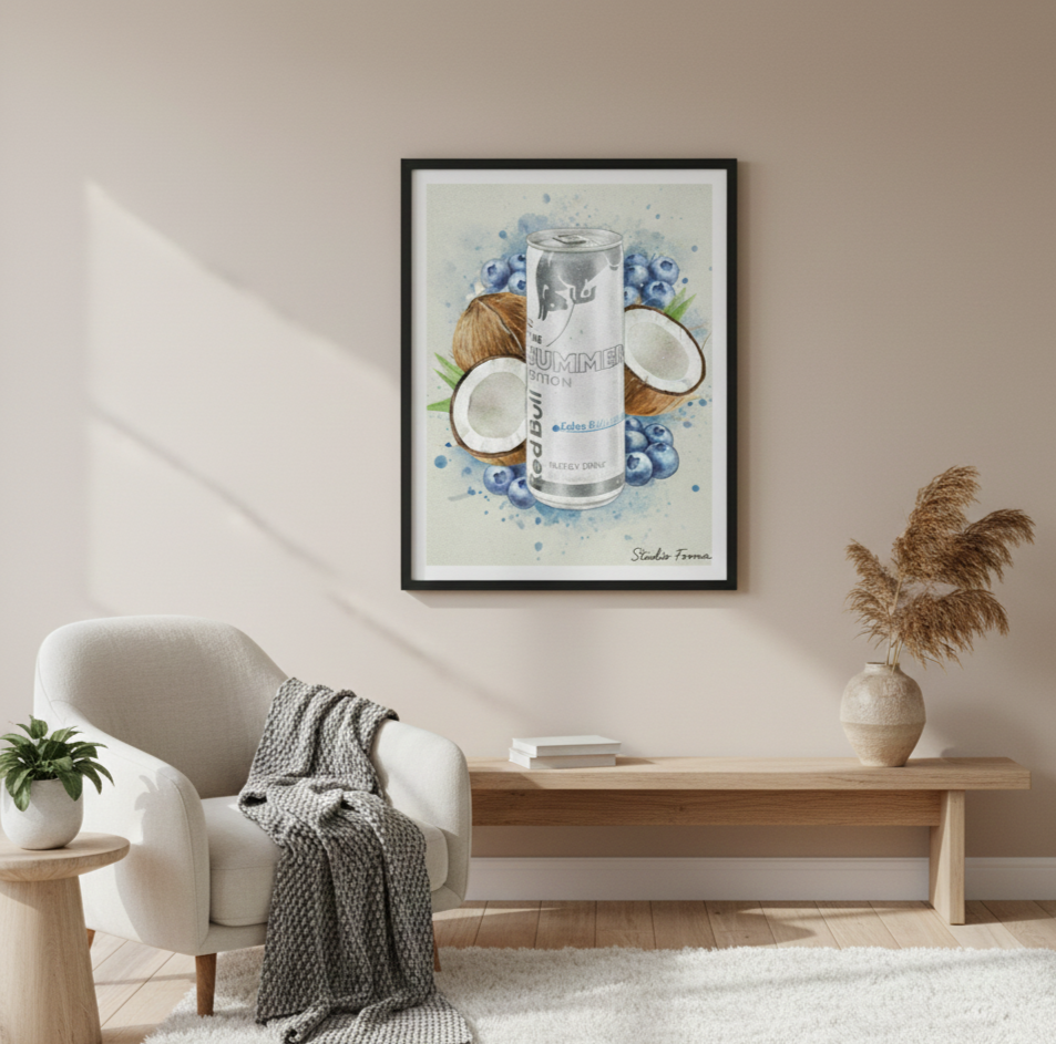 Ge dina väggar en modern och urban känsla med vår Redbull Kokos Blåbär inspirerade Poster. Denna unika konstposter är tryckt på matt premiumpapper och föreställer en stilren illustration av den ikoniska Redbull-burken, kombinerad med konstnärliga detaljer och tydliga street art-vibbar. Perfekt för dig som vill addera färg, energi och attityd till ditt hem eller kontor.